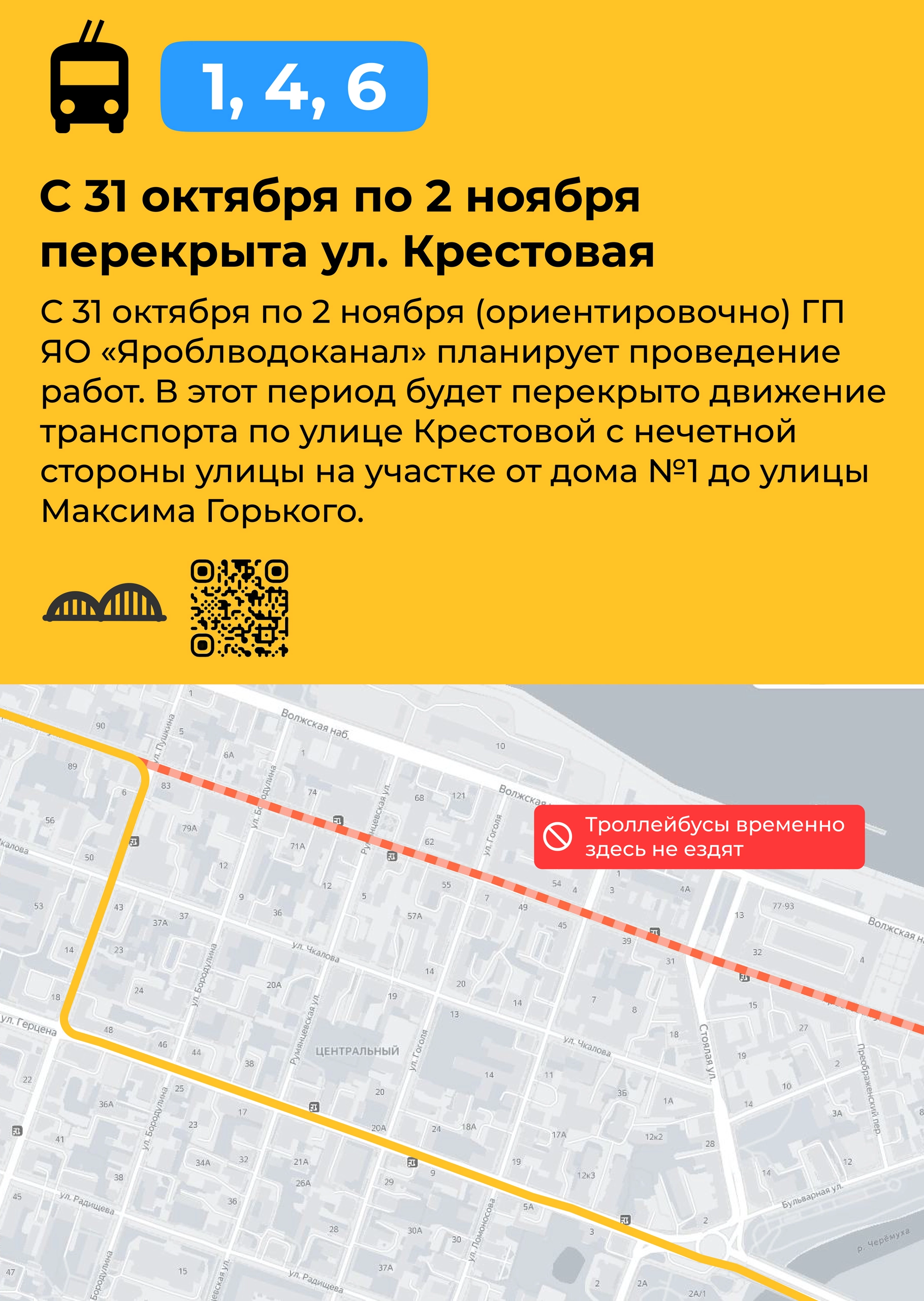 Предварительно сообщаем, что 31 октября 2025 года с 09:00 и до окончания работ будет закрыто движение транспорта по ул. Крестовой с нечетной стороны на участке от дома № 1 до улицы Максима Горького, в связи с проведением работ ГП ЯО «Яроблводоканал». На данный период изменяется движение муниципальных и межмуниципальных автобусных маршрутов. О том, как будет организовано движение по маршрутам № 1, № 2, № 3, № 10 (№ 10с), № 33, № 107, № 108, № 114 — подробнее расскажем ниже: